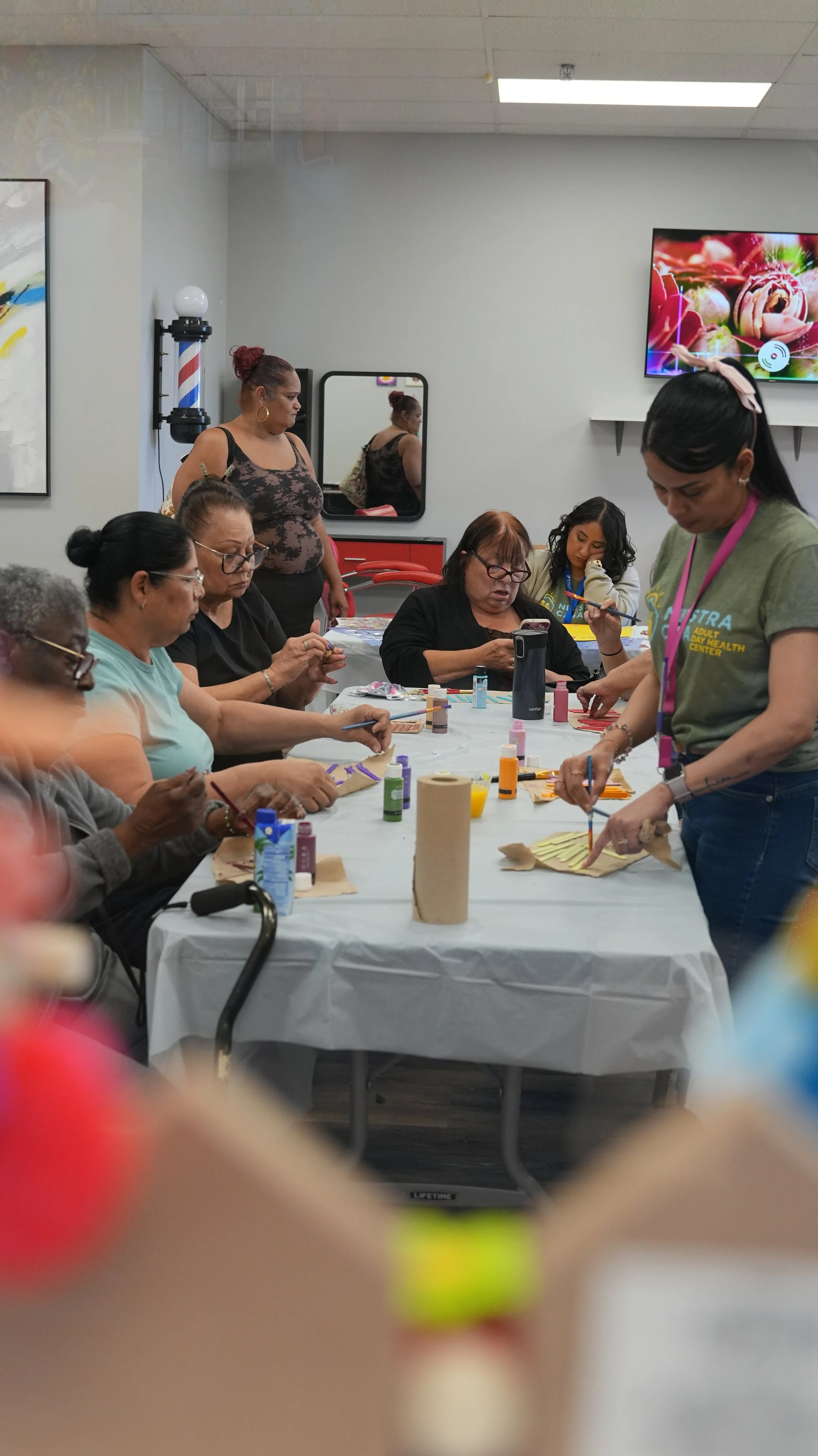 A group of women participating in a crafting or painting activity at a table in a community center.