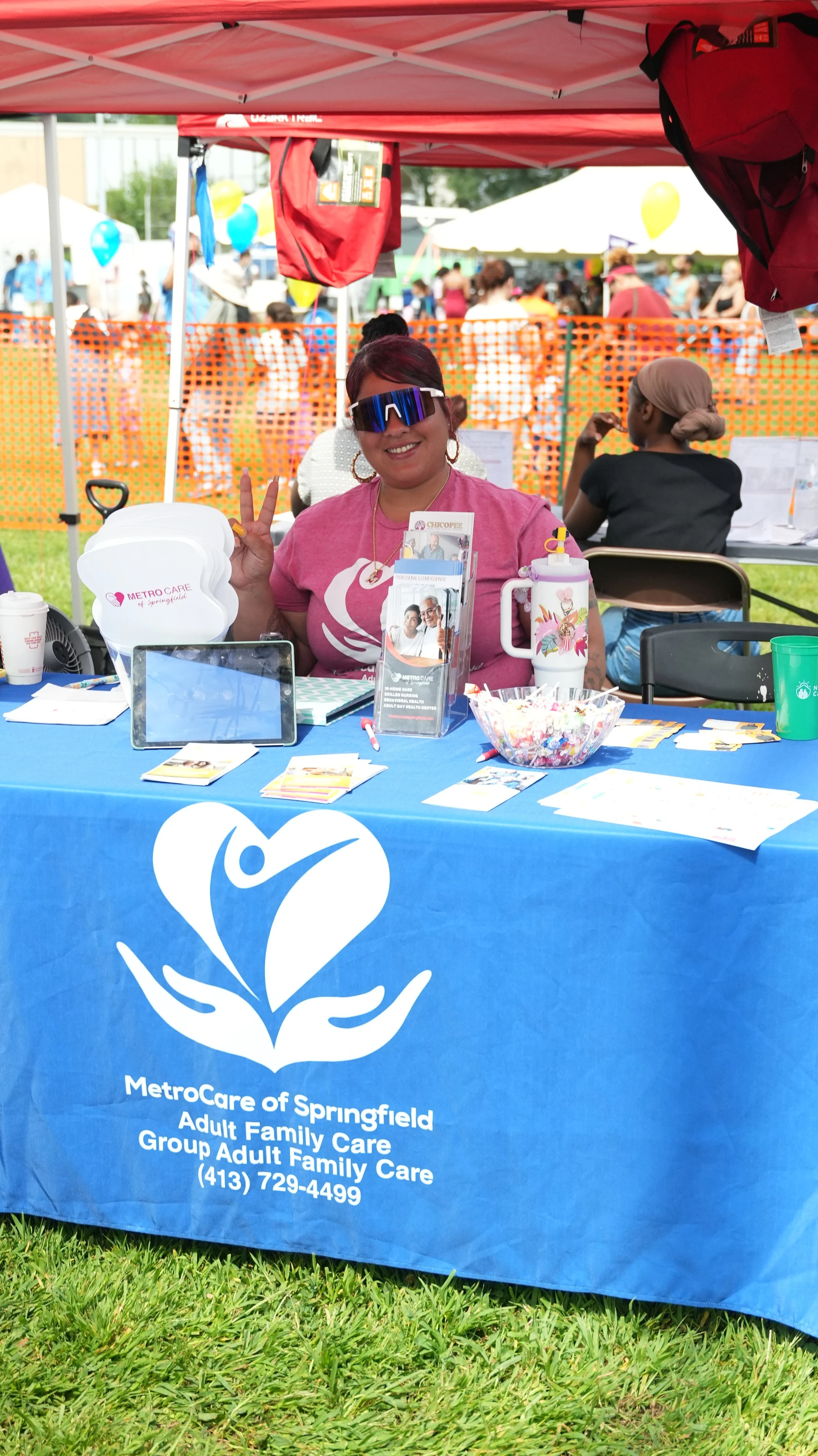A woman smiling at a booth under a red canopy at an outdoor event. The table has a blue tablecloth with white lettering and logo for MetroCare of Springfield Adult Family Care. On the table are pamphlets, a tablet, a bowl of candy, and a water bottle. In the background, there are other booths, balloons, and people attending the event.