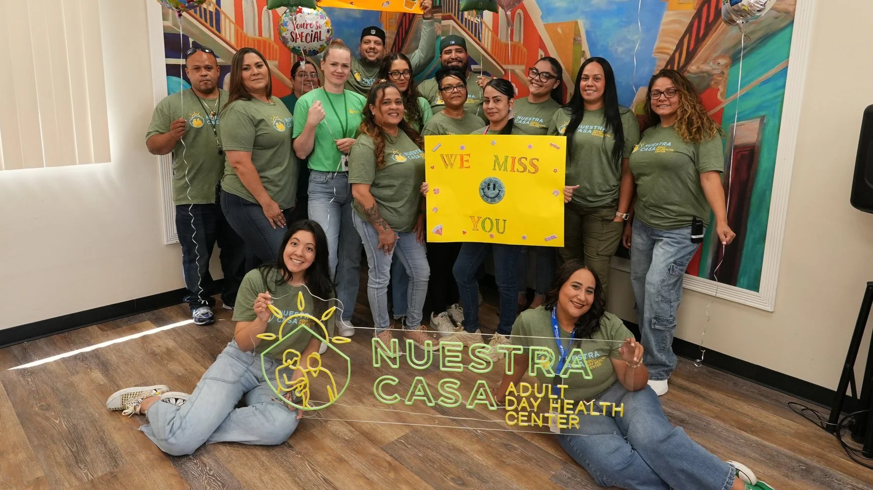 Group photo of diverse adults celebrating, holding a yellow sign saying "We Miss You," with a neon sign spelling "Nuestra Casa Adult Day Health Center" on the floor. They are in a room with colorful mural artwork.