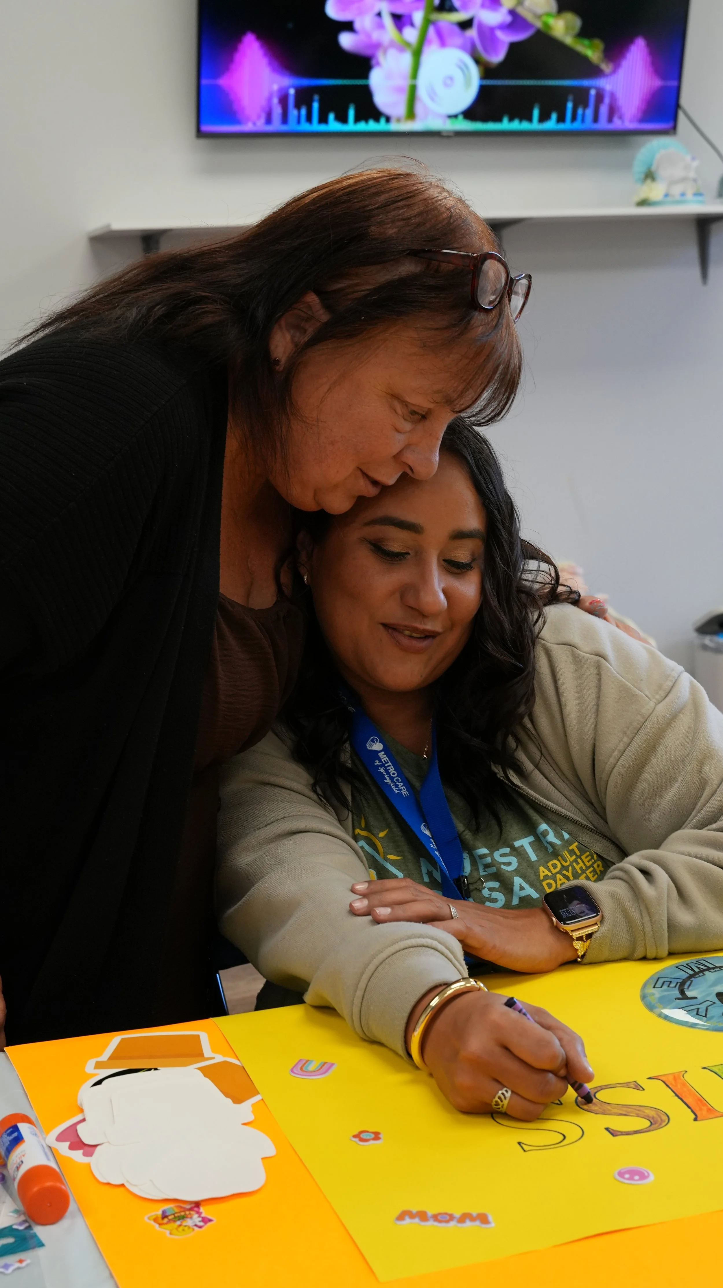 Two women are sitting at a table, one is writing on a yellow poster board decorated with stickers, while the other is leaning over her in a supportive manner. In the background, a television screen displays a colorful image of a flower and sound wave graphics.